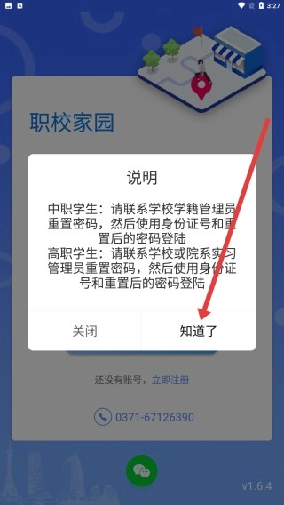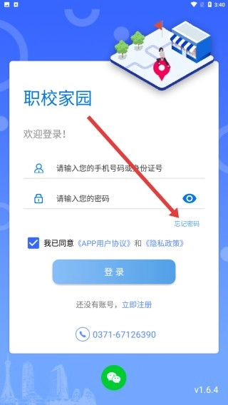 1、安装职校家园,打开后输入手机号或身份证号及密码登陆。