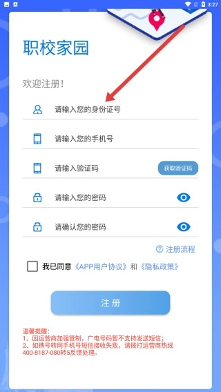 3、在进入到职校家园注册页面中后,按照输入框要求依次输入信息完成注册操作。