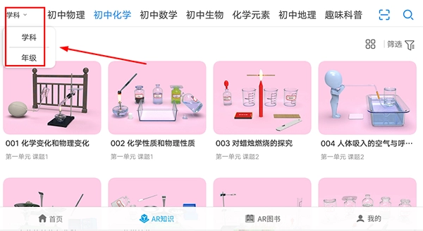 1、打开生动科学AR应用,点击界面下方的“AR知识”板块,即可进入学习页面;
