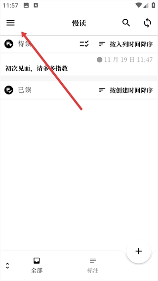 1、进入慢读,点击左上角菜单按钮,展开功能侧边栏。
