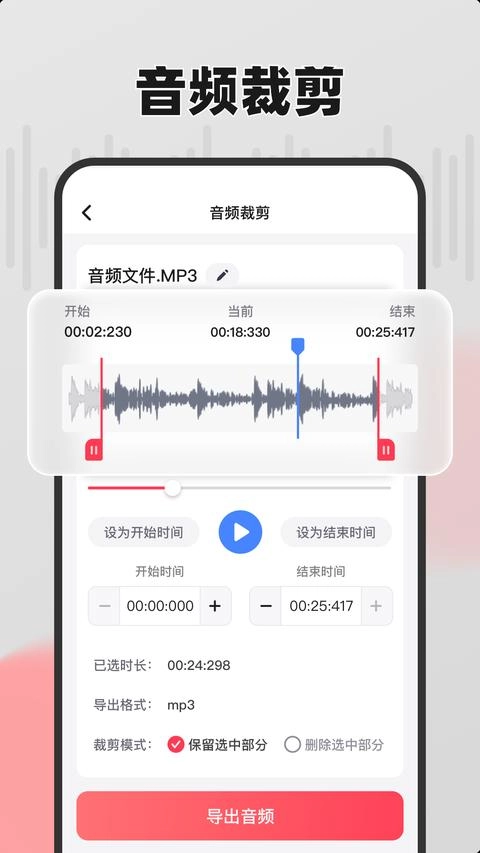 - 支持音频裁剪功能:可通过指定起始与结束的时间点,对音频进行截取操作。