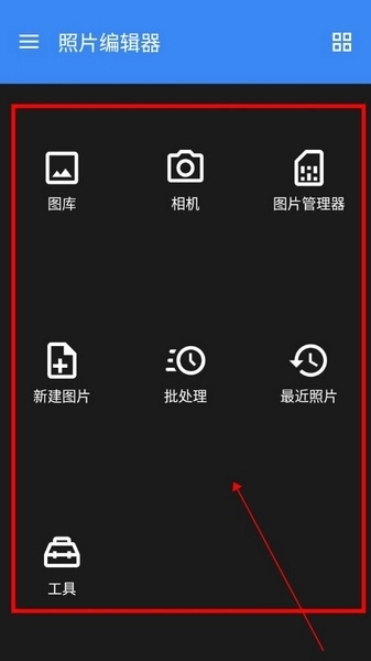 1、安装并打开Photo Editor后,在主界面中,你既可以点击【相机】拍摄照片,也能借助【图库】功能添加图库内的照片进行处理。