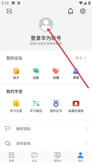 2、在个人页面找到【登录华为账号】的区域并点击,即可进入华为账号的登录或注册界面。