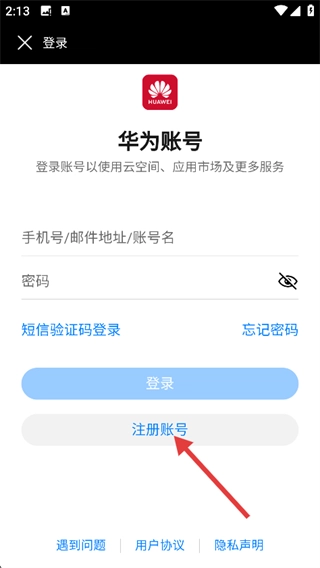 3、在华为账号界面点击【注册账号】,进入手机号填写页面。
