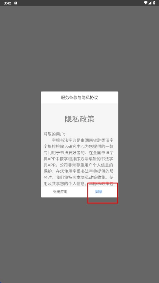 1、点击【同意-功能按钮】,进入字根书法字典主界面。