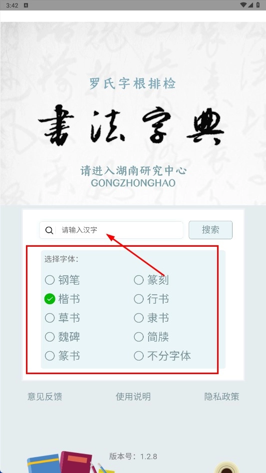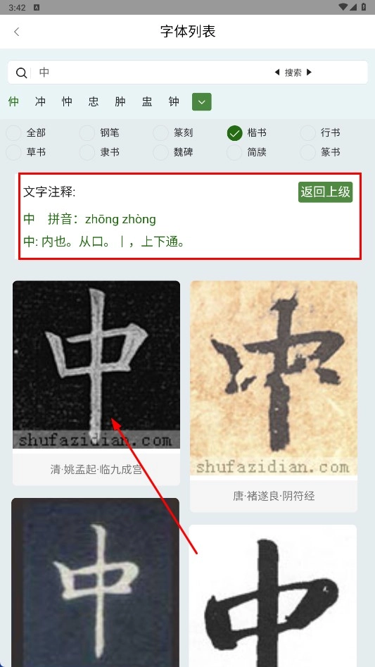 2、在主界面选择字体(如楷书),在搜索框输入汉字后点击【搜索-功能按钮】,进入字体列表页面。