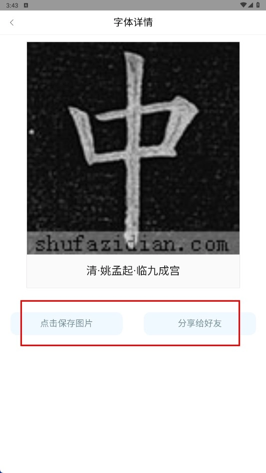 4、进入字体详情页面后,可通过点击【点击保存图片】按钮保存字体图片,也能点击【分享给好友-功能按钮】来分享字体详情。