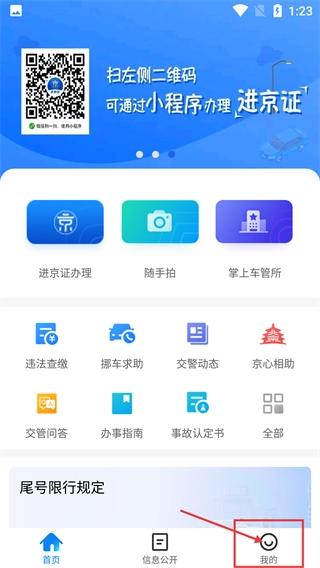 1、在首页底部点击【我的】进入个人中心,该页面包含【进京证办理】-【随手拍】等功能,用户可通过扫码的方式办理进京证。