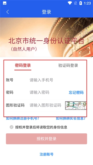3、进入登录页面后选择【密码登录】选项,此时需要依次填写【账号(手机号)】、【密码】以及【图形验证码】,在勾选相关授权协议后,即可点击登录按钮完成登录操作。