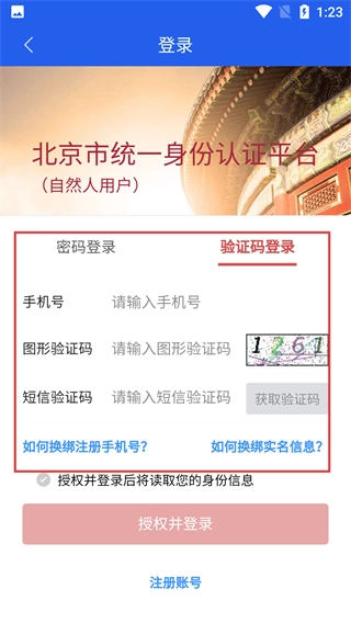 4、若选择【验证码登录】方式,需依次输入【手机号】和【图形验证码】,随后获取并填写【短信验证码】,完成上述步骤后即可完成授权登录操作。