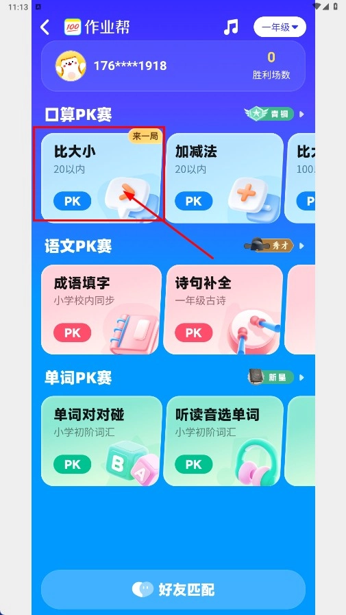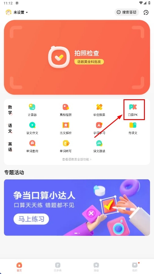 1、在首页功能板块,点击【口算PK-功能选项】,进入PK页面。
