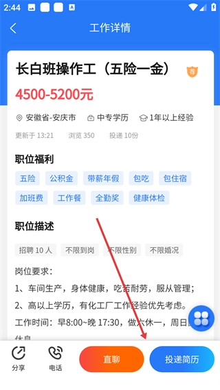 4、在工作详情界面可选择【直聊】或【投递简历】完成求职操作。