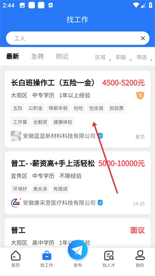 3、在求职界面挑选合适的岗位,比如“长白班操作工(五险一金)”这类职位。
