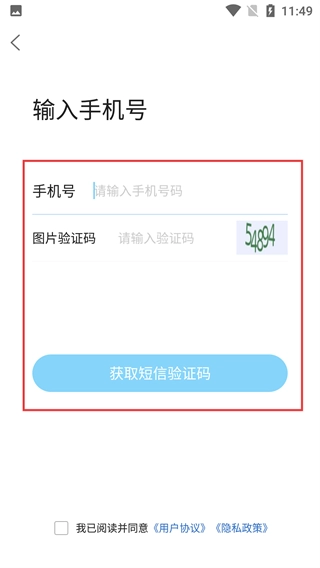 4、进入输入手机号的页面后,填写手机号码并输入图片验证码,接着点击【获取短信验证码】按钮,就能完成整个注册流程。
