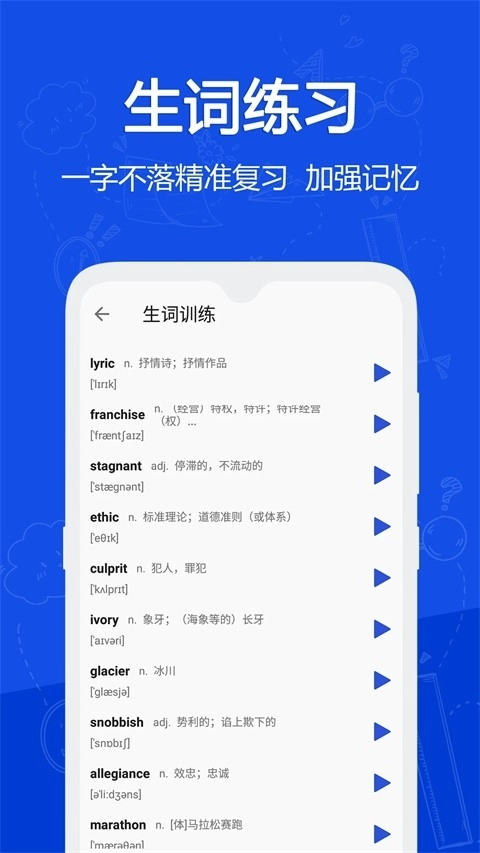 背单词,就选恋恋有词!这里有超全的单词库,涵盖四六级最新词汇,还有各学段所需的英语单词资源,只要你需要的单词,恋恋有词都能满足。软件会依据你的学习阶段和词汇量定制专属学习计划,学过的单词第二天还会自动安排复习,帮你把英语单词记得牢牢的!