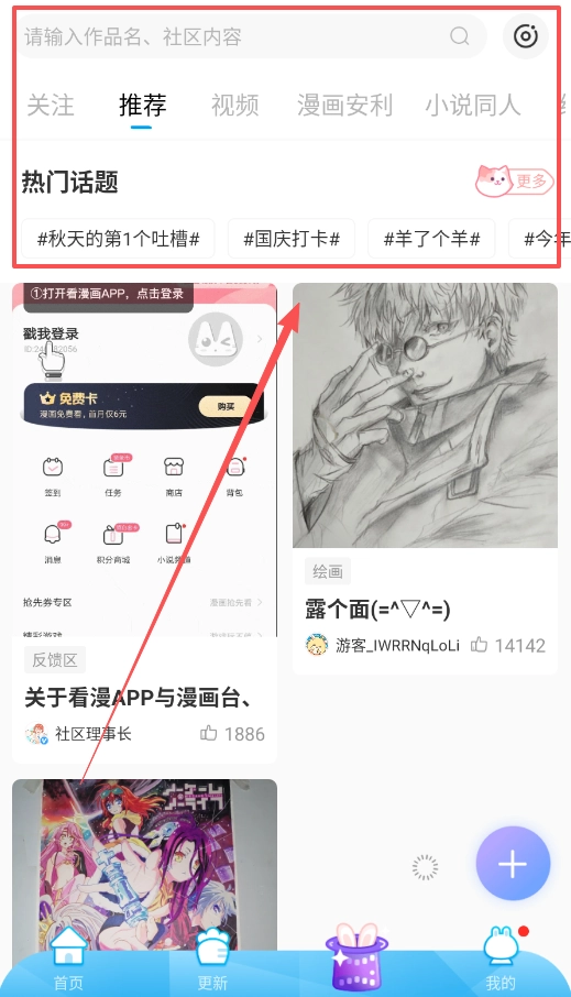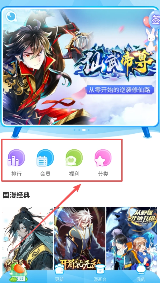 2、接着呢,回到首页可以浏览推荐漫画,或者通过分类功能按题材筛选,更新页面会展示最新上线的漫画章节。