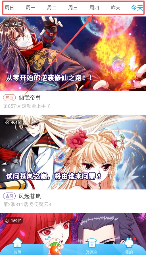 3、然后呢,在更新页面查看每周更新日历,标注了每天更新的漫画作品,点击感兴趣的封面就能开始阅读。