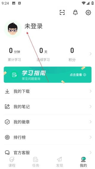 1、在课程页面,点击底部【我的】,进入个人中心查看学习相关功能。