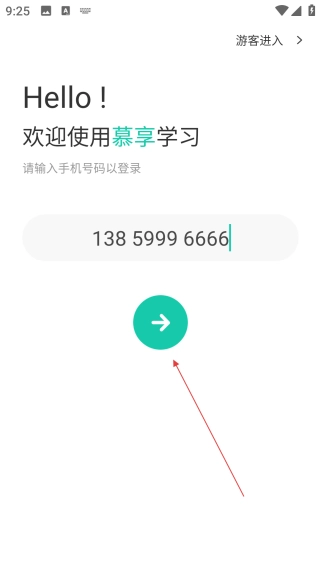 4、填好手机号后,点击【箭头按钮】,即可继续完成慕享学习的登录操作流程。