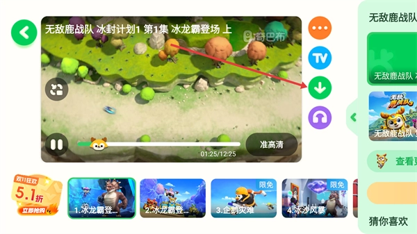 1、点击目标视频(例如【无敌鹿战队冰封计划1】),即可进入该视频的播放页面。