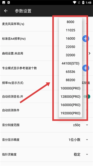 3、进入参数设置页面后,找到【麦克风采样率(/s)】这一选项,点击它右侧的下拉框,就能看到当前可供选择的采样率设置。