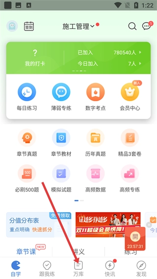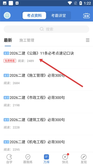 1、打开软件主界面后,点击底部的【万库】按钮,就能进入考点资料页面,在这里可以查看最新的二级建造师考点资料。