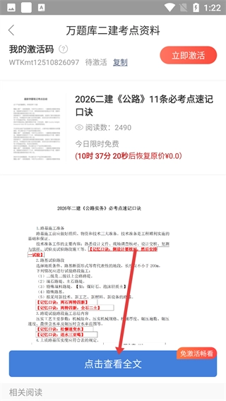 3、进入帖子详情页后,点击【点击查看全文】按钮,就能查看考点速记口诀的完整内容。