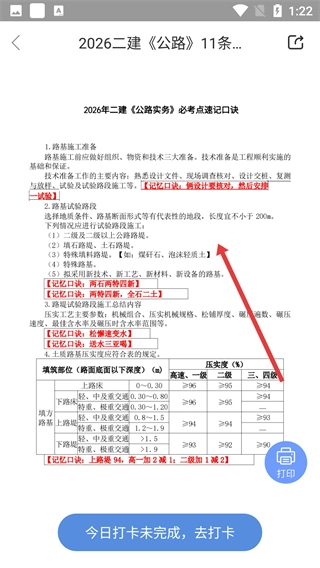 进入全文页面后,即可查看2026年二级建造师《公路工程管理与实务》的必考点速记口诀,其中涵盖了路基施工准备等知识点及其对应的记忆口诀,并且支持打印等相关操作。