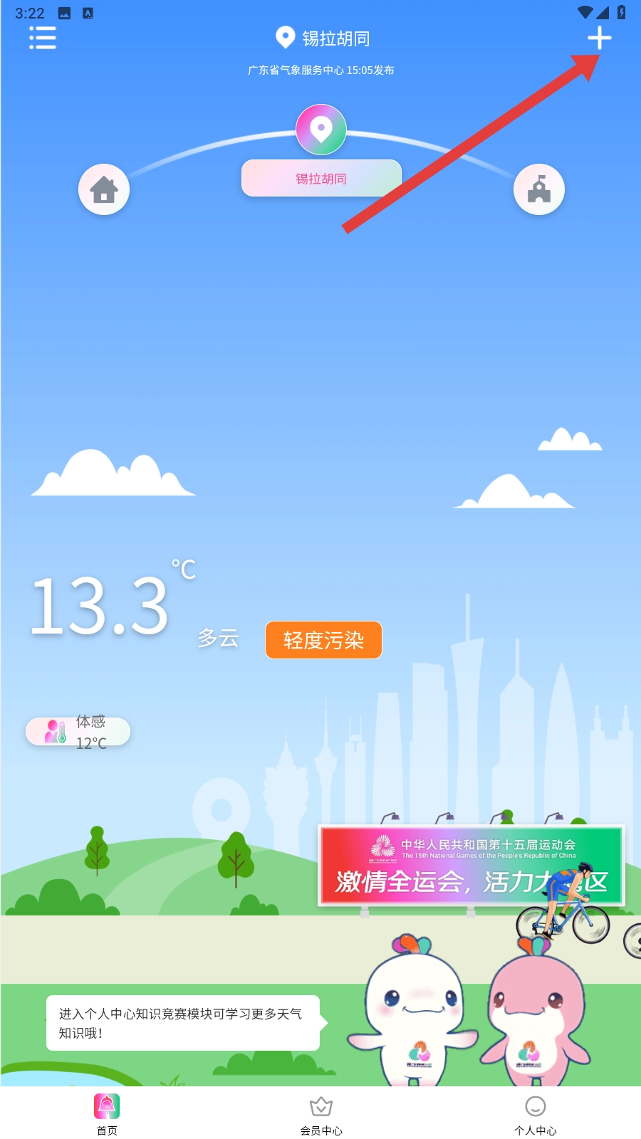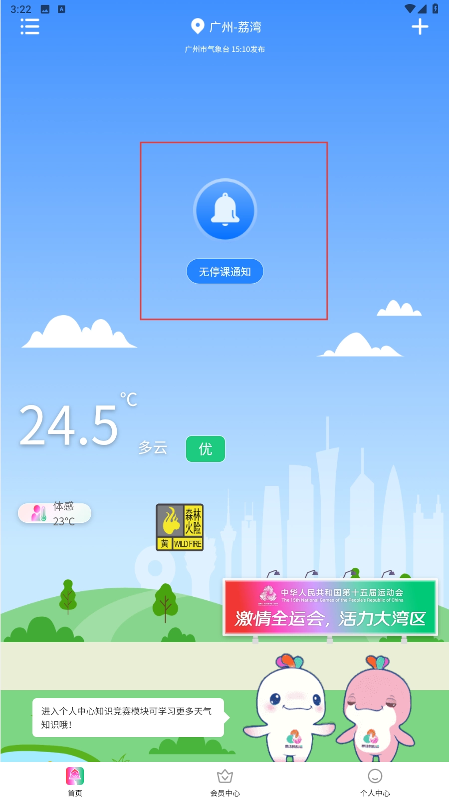 4、添加关注地点后,可在首页查看该地点的天气及停课通知等信息。