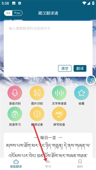 1、在藏汉翻译通主界面,点击底部【学习】选项,进入学习板块,可进行藏语或普通话学习。