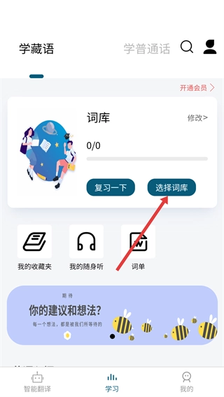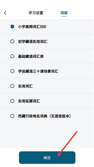2、在学习板块的学藏语界面,点击【选择词库】按钮,进入词库选择界面。