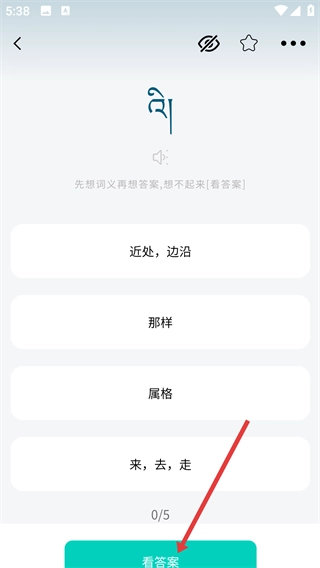4、在学习答题界面,点击【看答案】按钮,可查看题目答案,进行藏语词汇学习。