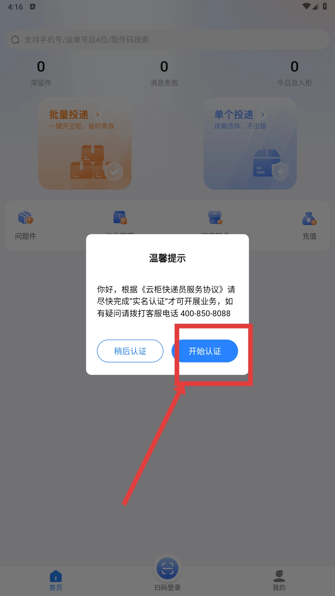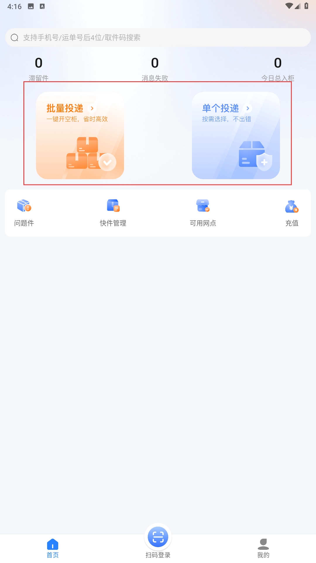 3、认证完成后,在首页选择【批量投递-功能】,可一键开空柜处理快件。