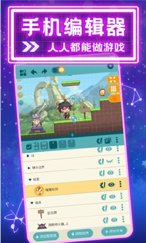 《唤境》是一款十分实用的手机游戏编辑制作工具,在这里你能认识不少独立游戏创作者,和众多游戏爱好者交流探讨,获取更多游戏创作相关的信息与知识;还可以发送弹幕直接表达看法,在游戏里感受和同龄人分享的快乐。尤为关键的是,软件的引擎具备智能游戏逻辑事件表,通过把简单的触发条件与执行动作相融合,就能轻松实现复杂的游戏逻辑,用户上手使用起来非常容易。