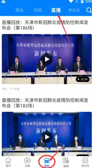 点击功能栏中的“视听”选项,接着选择上方的“直播”板块,就能在线观看各场防疫新闻的回放内容了!