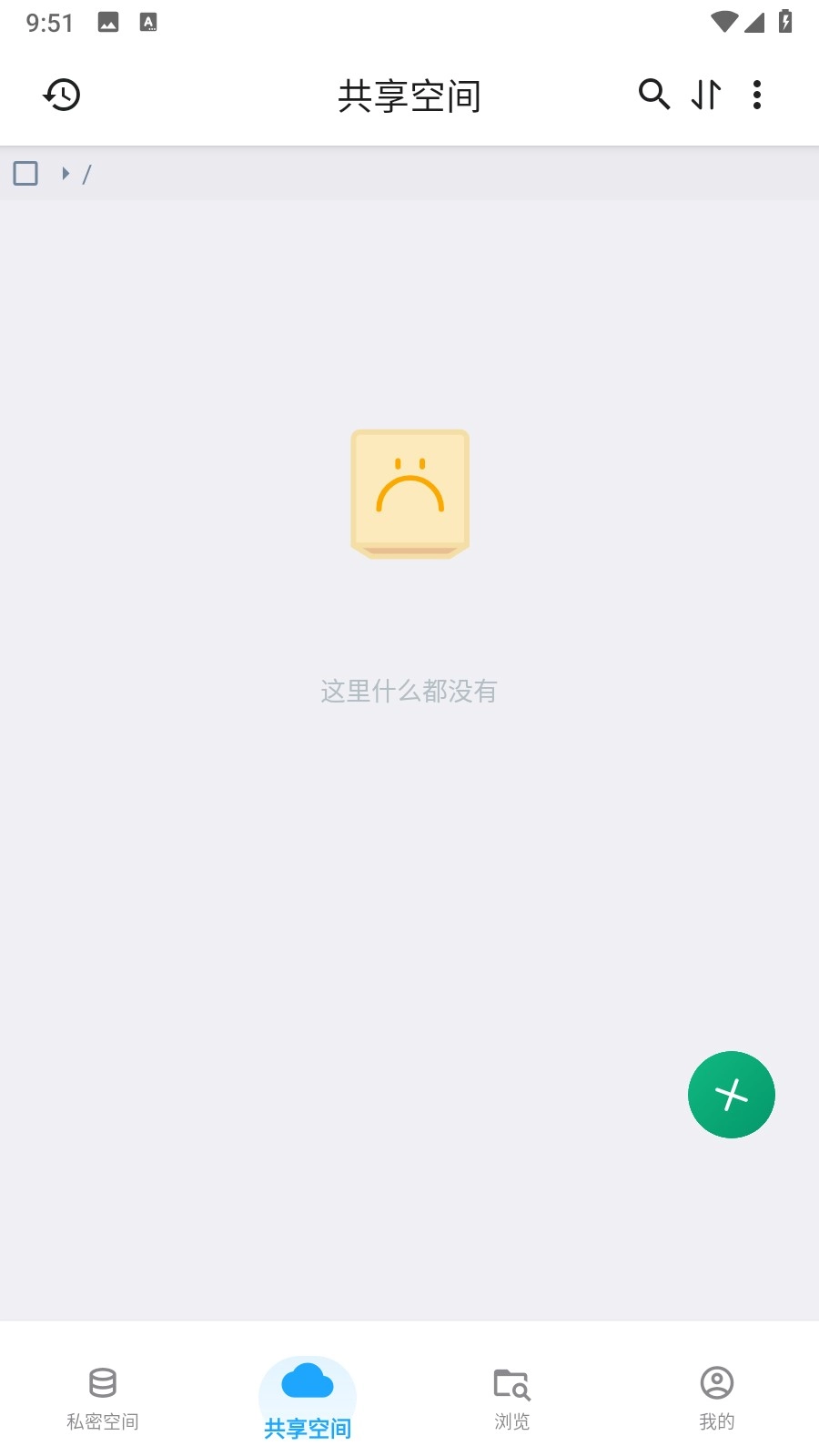 4、注册成功后,进入【共享空间】页面,可点击右下角绿色【+】按钮,上传文件至网盘。