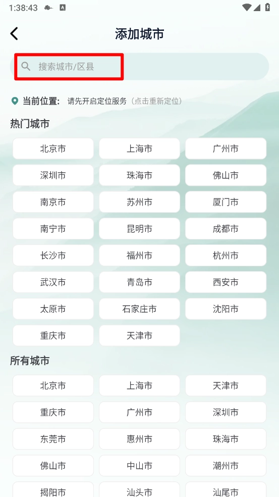 4、如图所示,可选择需要的热门城市,也能直接搜索具体的城市或区县。