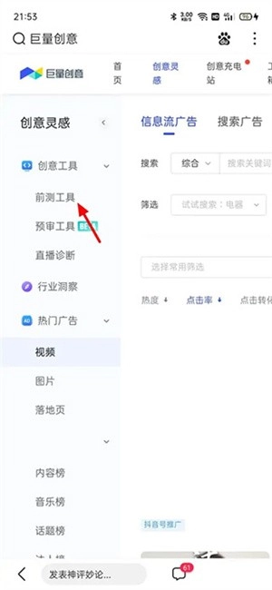 在创意灵感页面,单击前测工具。