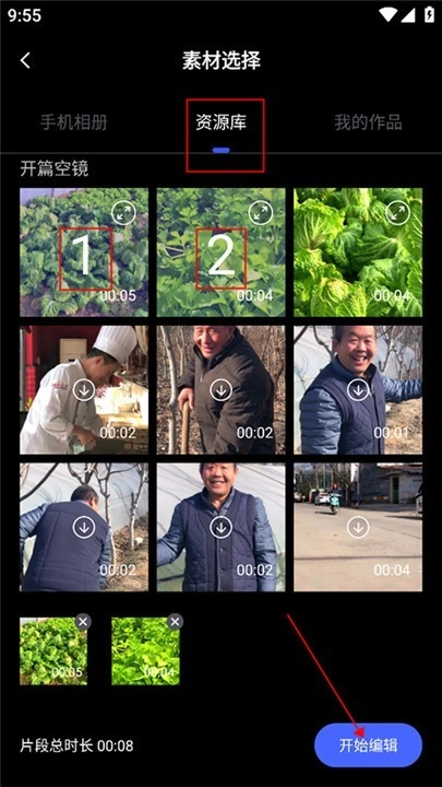 3、在素材选择页中,挑中你钟意的素材,接着点右下角开始编辑,剪辑模式即刻启动。