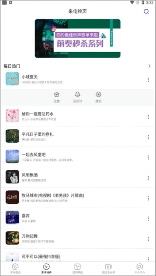 4、在来电铃声中,选择任意歌曲可以对其收藏、设置彩铃、播放。