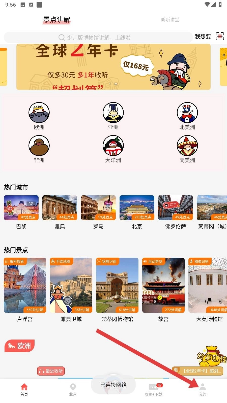 2、完成登录后,回到首页,可按需选择全球不同大洲,热门城市及热门景点,获取对应讲解内容。