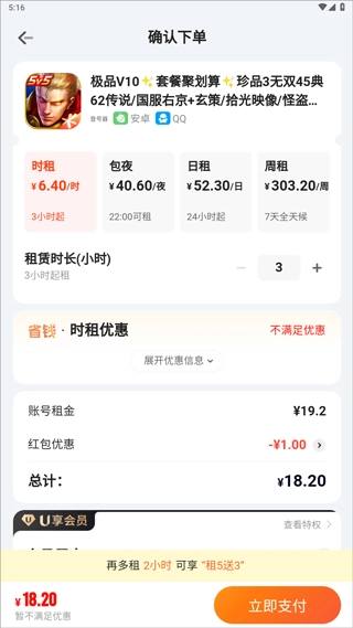 3、租用x小时,即可额外获赠x小时时长。价格保持不变,快乐体验却能加倍。我们采用专业级别的账户保护机制与防作弊技术,全方位保障出租人的账户安全。