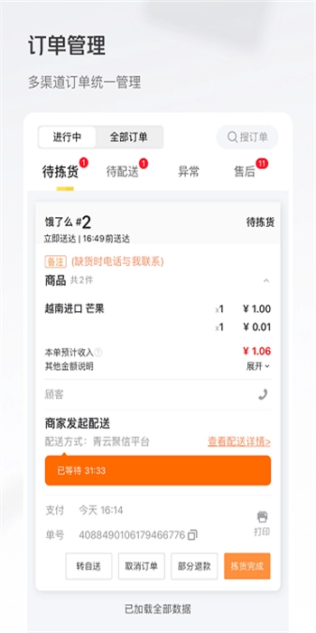 适应大、中、小商户的高效拣货能力,聚合多个平台,提供高品质配送服务。