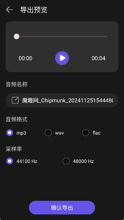 6、最后点击【导出】按钮完成剪辑,输入名称并选择好音频格式和采样率,确认后进行保存导出。