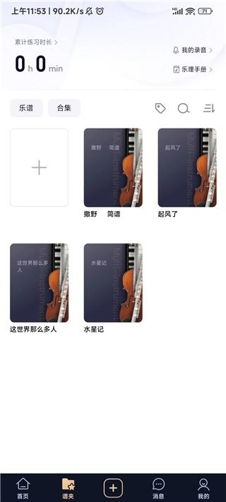 5. 点击“谱夹”选项,我们可以查看自己的练习时长以及所有收藏的乐谱。