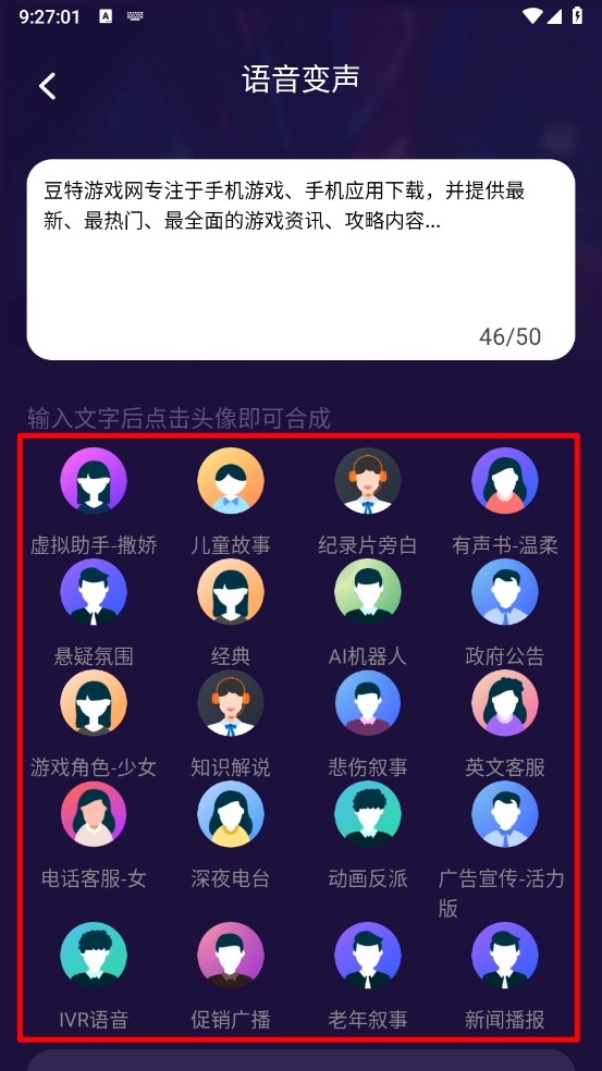 2、如图,输入所需变声的内容,并选择所需合成的音色。