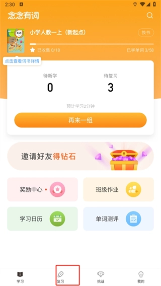 2、接着打开应用,进入首页后点击切换至【复习】页面;