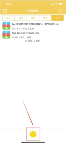 完成后,在手机桌面上找到“解压专家”并打开进入其界面。接着点击软件界面底部那个黄色的“+”号按钮,就像下面图片展示的那样。