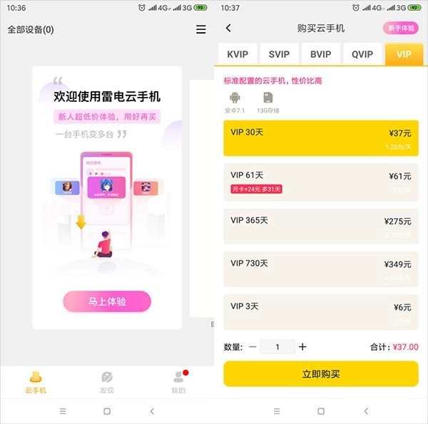 2、接着注册并登录账号,然后在云手机里获取设备(当前建议选择Qvip、Svip);