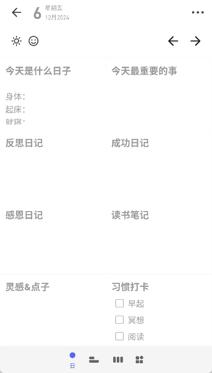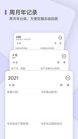 我们提供强大又灵活的格子形式,助力你专注于回顾、思考与记录,重新掌控自己的日记。让你下笔更顺畅,每日的总结、回顾和反思也能更高效,通过填写格子还能收获满满的充实与满足感。